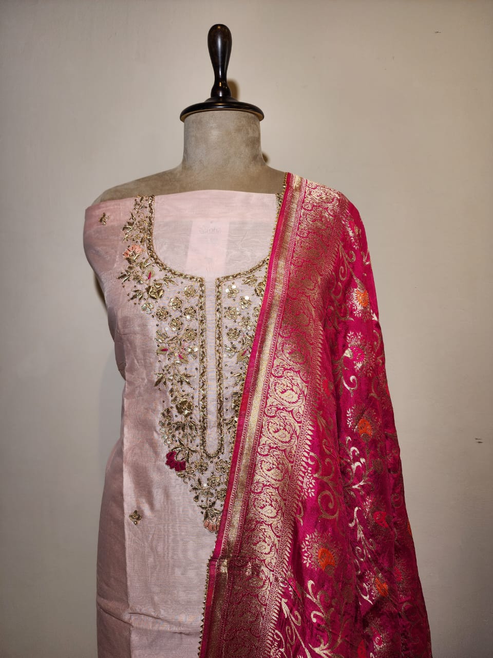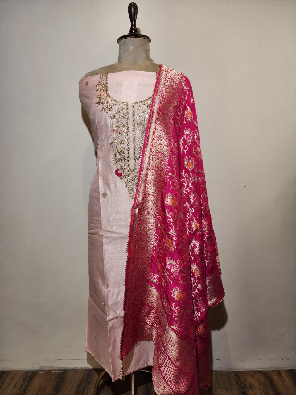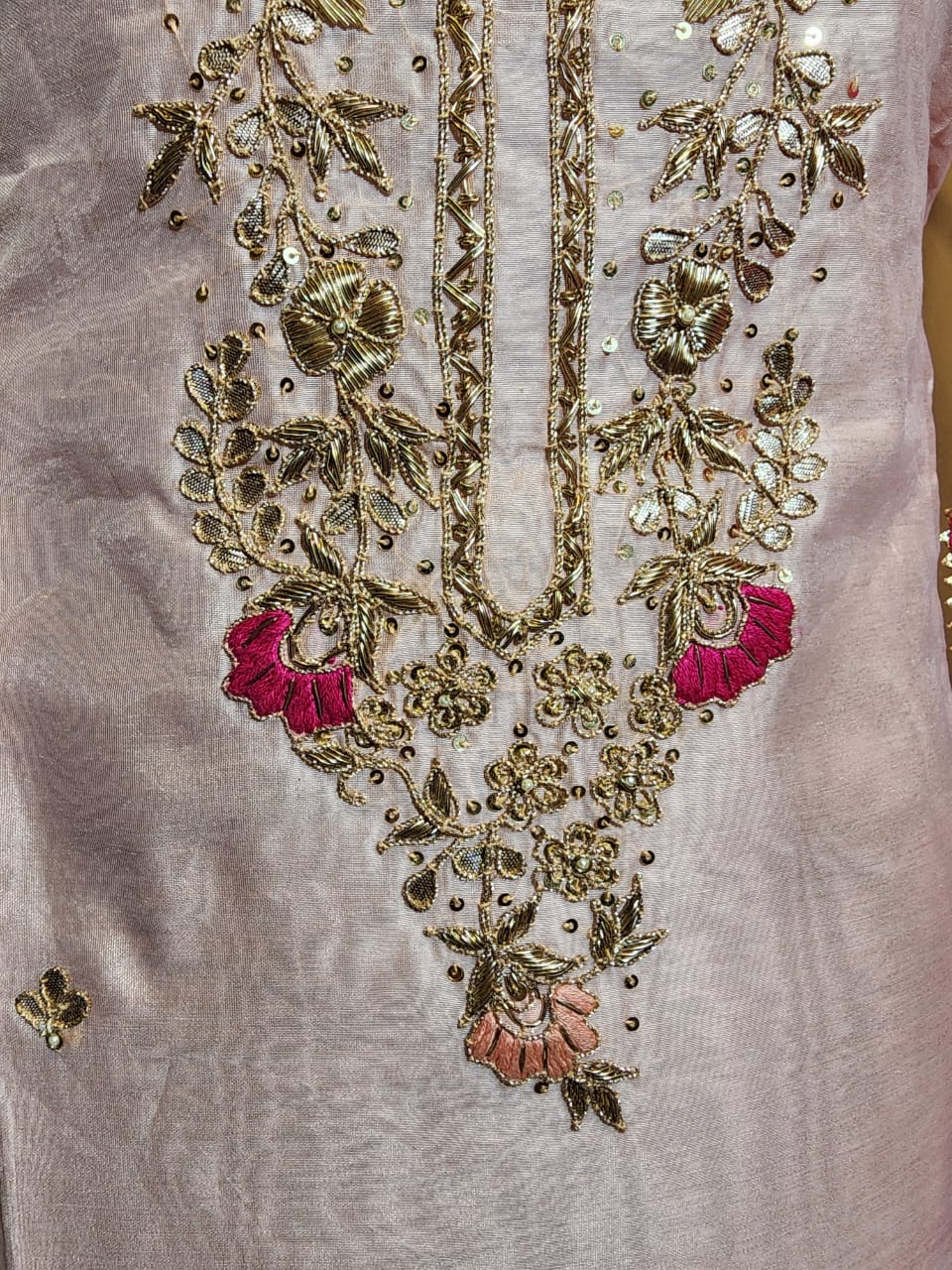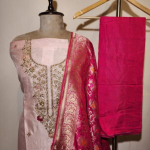 This graceful unstitched suit features a soft pink base adorned with delicate zardozi embroidery. The outfit is designed to offer a refined, feminine look, perfect for casual gatherings, festive occasions, or daytime events. Its pink colour palette flowy fabric make it ideal for warm seasons, ensuring both elegance and comfort. The suit includes a beautifully embroidered front panel paired with a coordinated dupatta for a complete, harmonious ensemble.