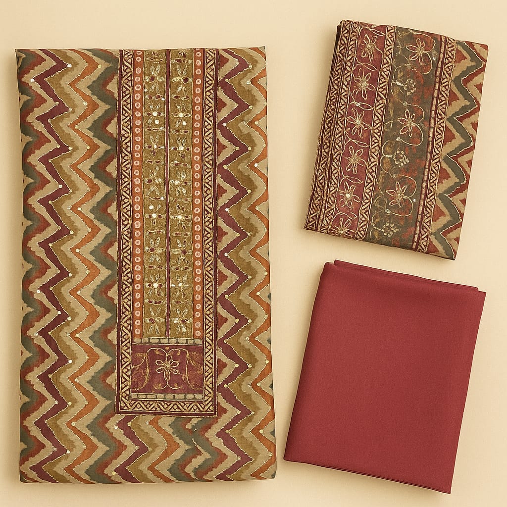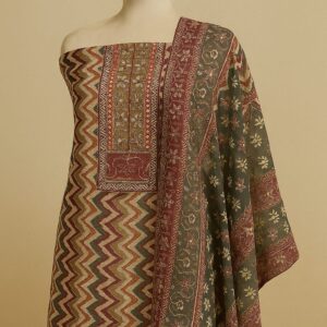 The kurta showcases intricate embroidery in a serene multi, placed gracefully on the zig zag print.