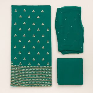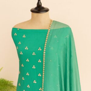 Elevate your ethnic wardrobe with this elegant unstitched suit set in a graceful blue shade with Crafted from a fine, sheer fabric likely Crape this suit features intricate white sequence all over kurta and dupatta, adding a touch of traditional charm and elongating the silhouette.