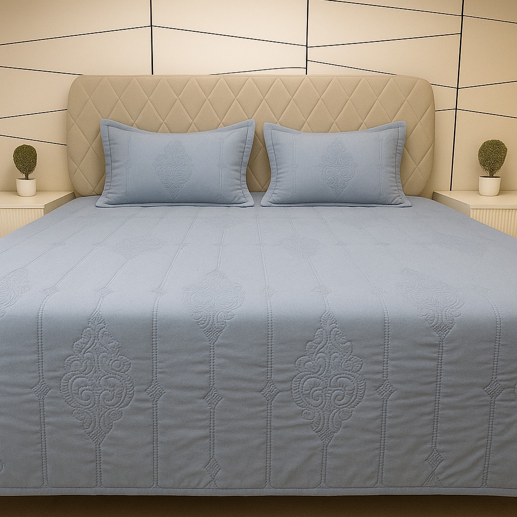 The Grey bedcover in the image is an elegant and luxurious bedsheet with a subtle floral embroidery pattern. It features a deep grey base with intricate stitched designs of flowers and leaves that add texture and visual interest. The bedcover is paired with matching pillow The overall look is modern, stylish, and perfect for a contemporary or classic bedroom décor.