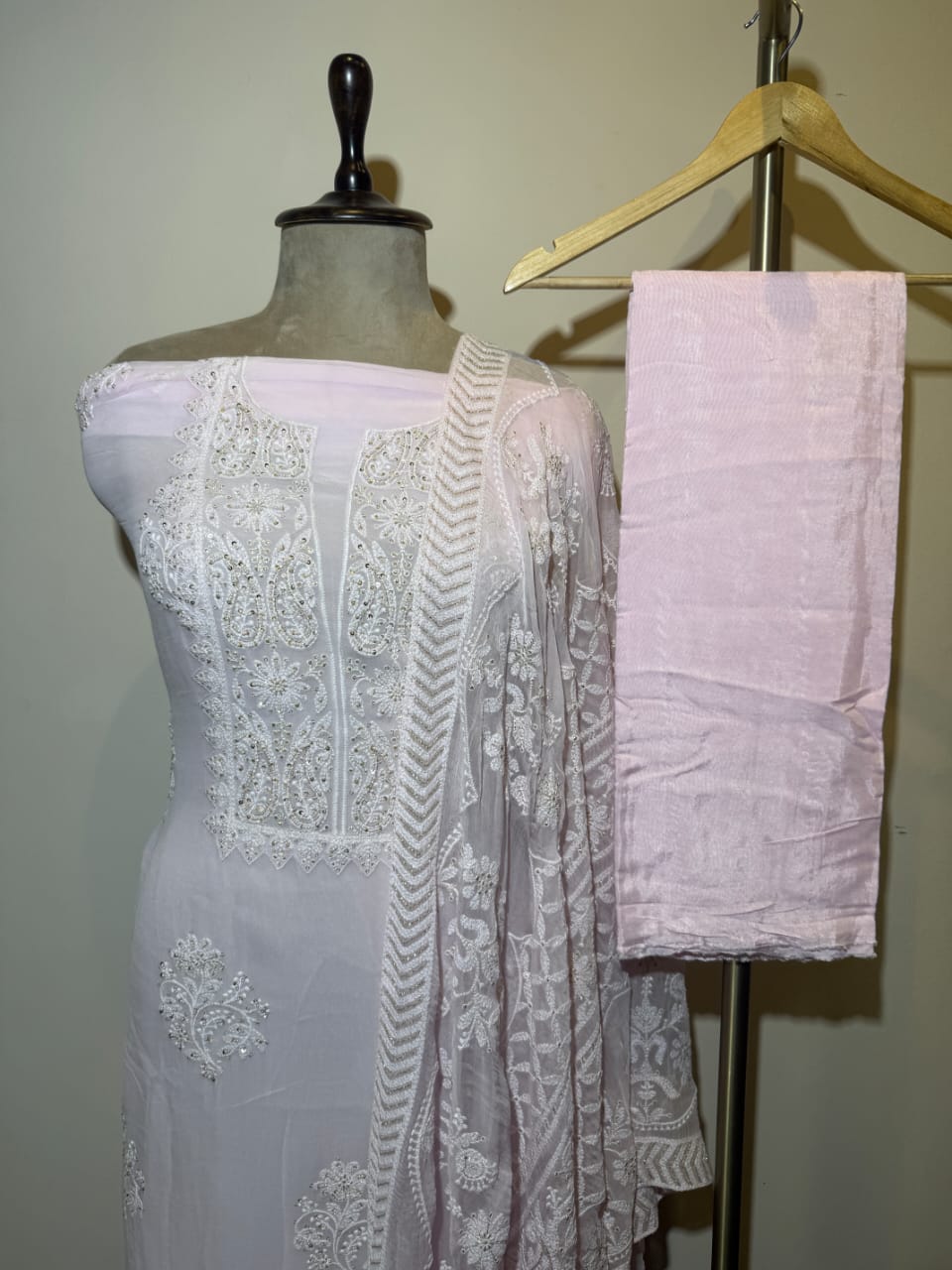 Elevate your ethnic wardrobe with this elegant chikankari unstitched suit set in a graceful pastel pink Crafted from a fine, decent fabric likely georgette this suit features intricate chikankari embroidery in contrasting Ivory threadwork and sequence on upper and chikankari dupatta, adding a touch of traditional charm and elongating the silhouette.