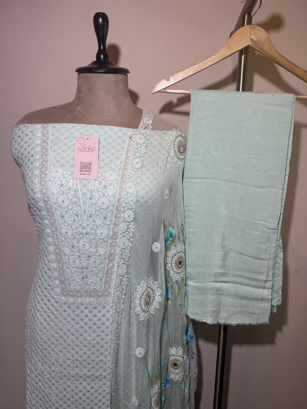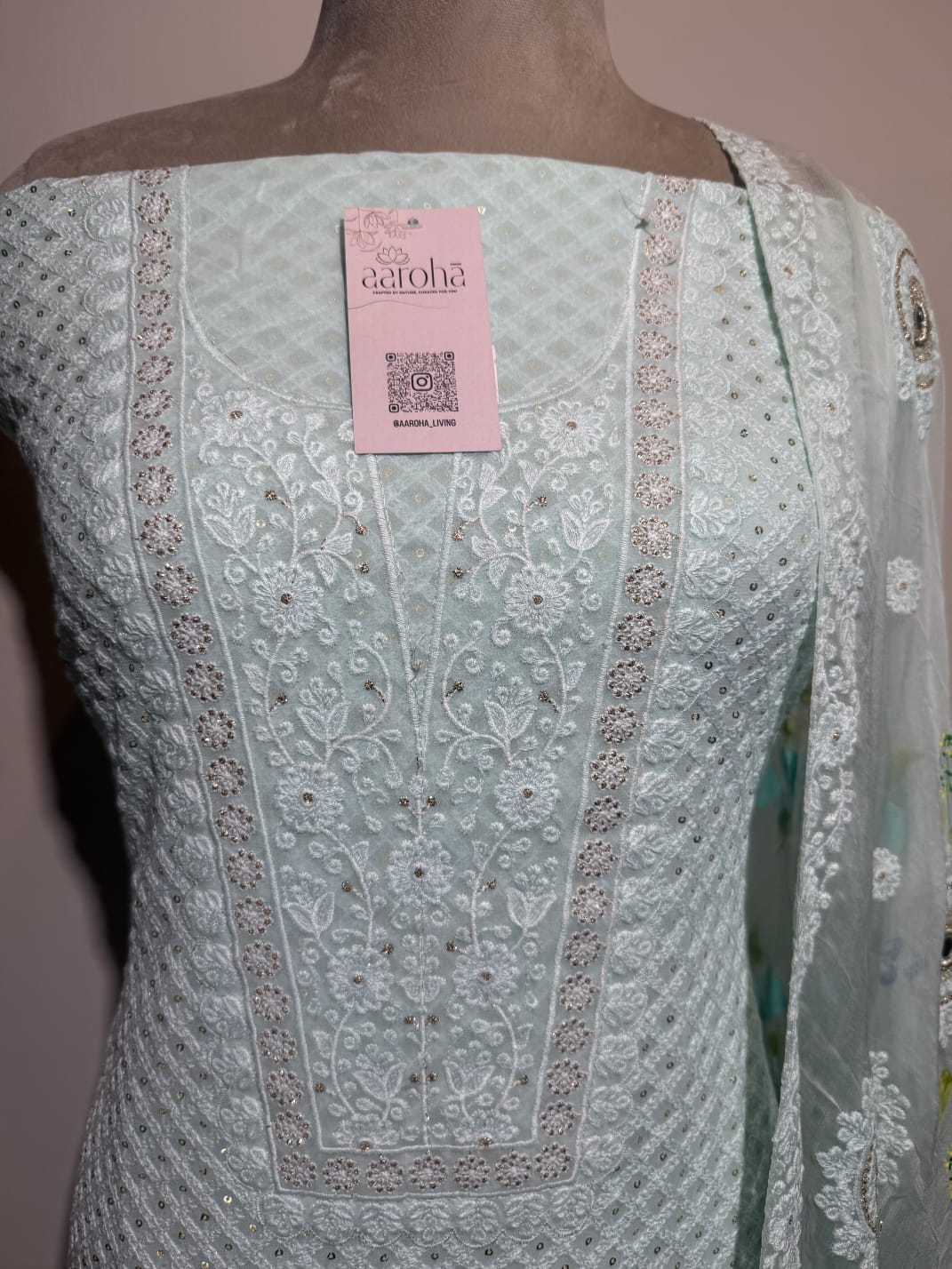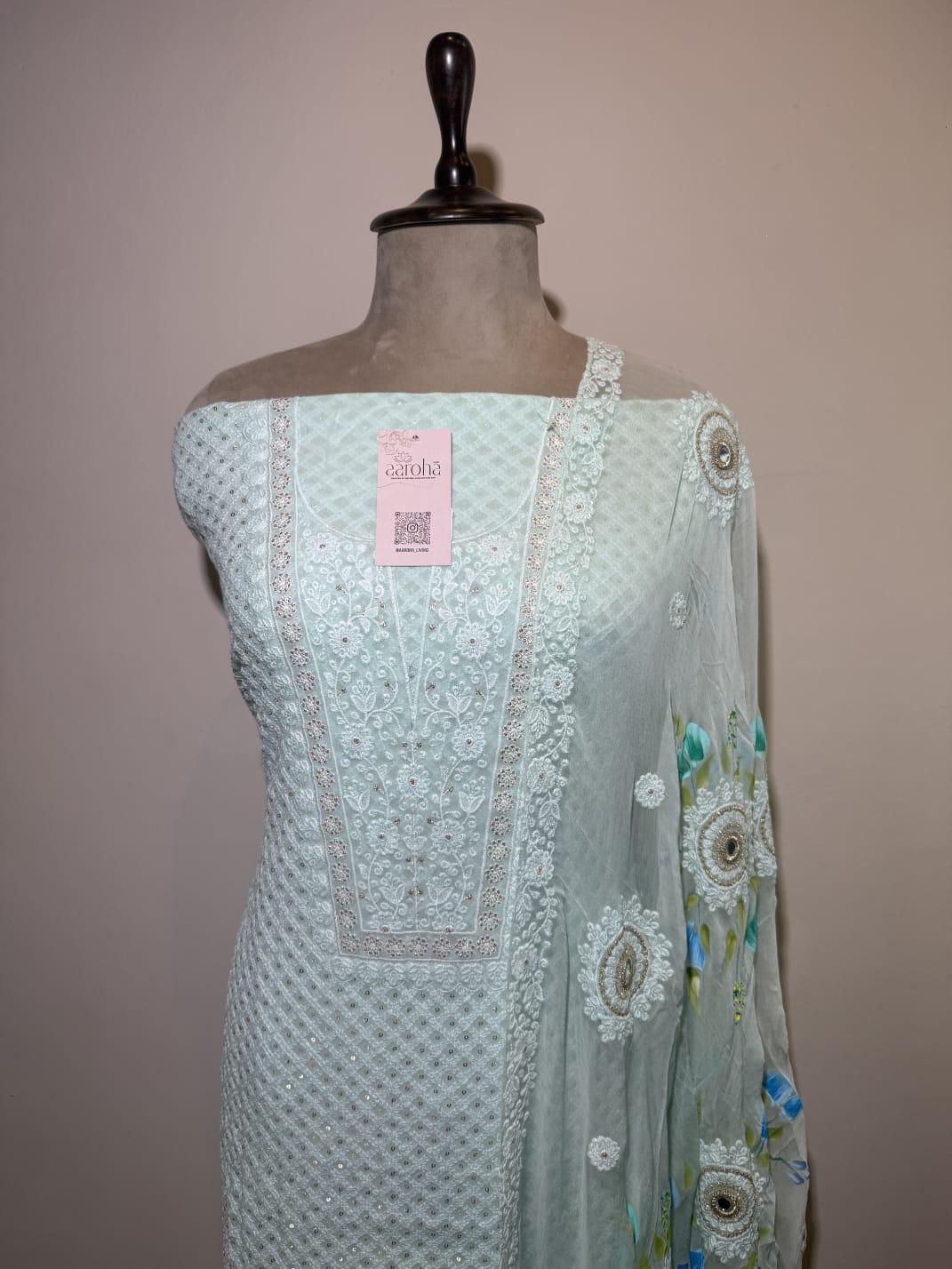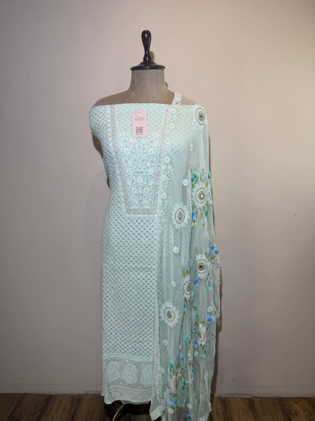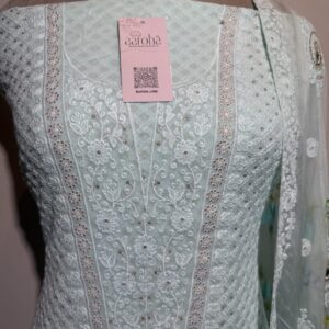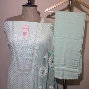 Elevate your ethnic wardrobe with this elegant chikankari unstitched suit set in a graceful pastel blue Crafted from a fine, decent fabric likely georgette this suit features intricate chikankari embroidery in contrasting Ivory threadwork and sequence on upper and floral prints dupatta, adding a touch of traditional charm and elongating the silhouette.