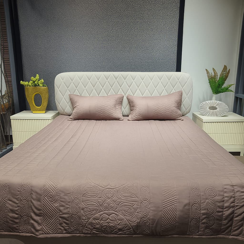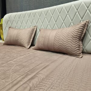 The brown bedcover elegant and luxurious with a subtle stitched pattern. It features a deep brown base with intricate stitched designs of paisley and leaves that add texture and visual interest. The bedcover is paired with matching pillow The overall look is modern, stylish, and perfect for a contemporary or classic bedroom décor