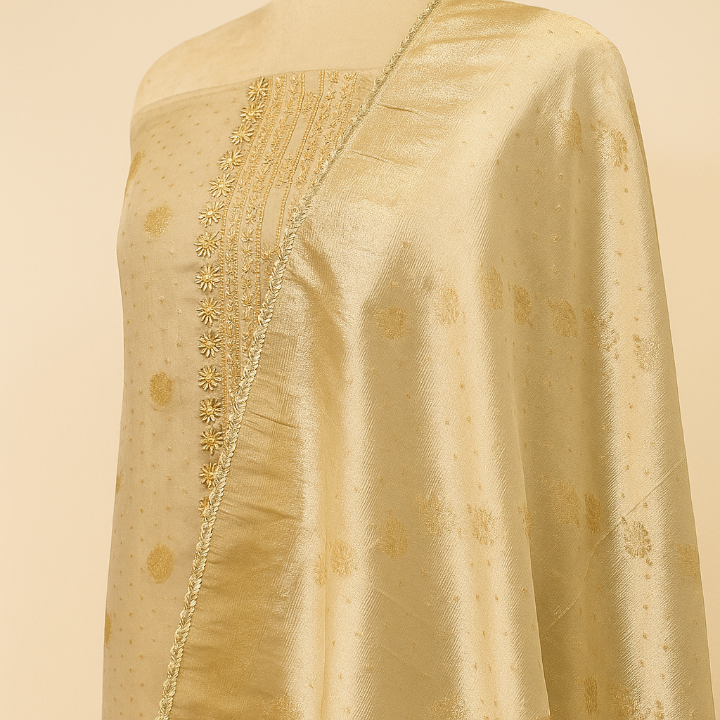 The highlight of the outfit is the hand-embroidered neckline, beautifully crafted with dabka, zardozi, and stonework. The embroidery showcases delicate floral motifs in shimmering gold threads, accented with coral and clear stones, creating a luxurious and festive look.