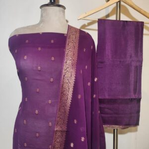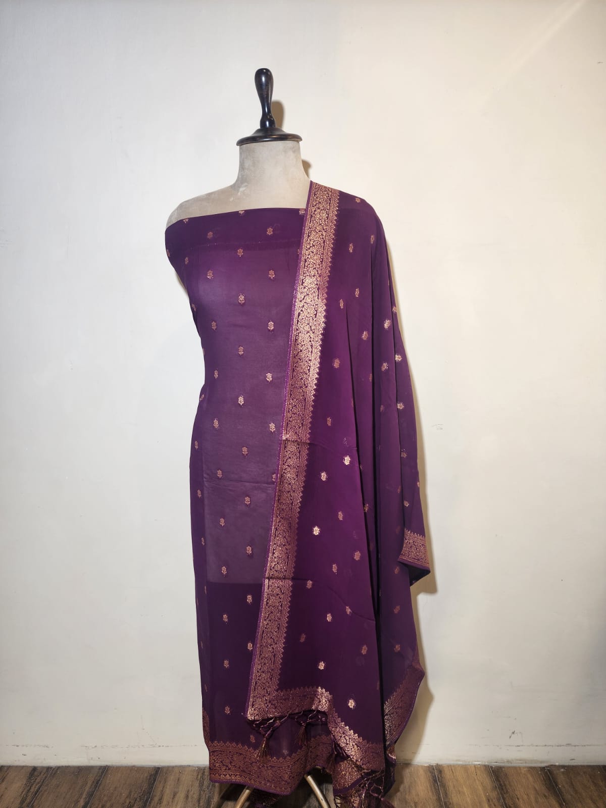 Elevate your ethnic wardrobe with this elegant golden Zari unstitched suit set in a graceful purple Crafted from a fine, decent fabric likely georgette this suit features intricate golden Zari Buti all over kurta and golden border with tassel on dupatta, adding a touch of traditional charm and elongating the silhouette.