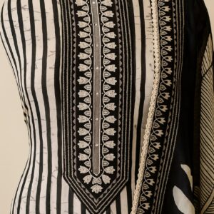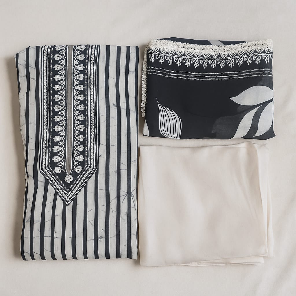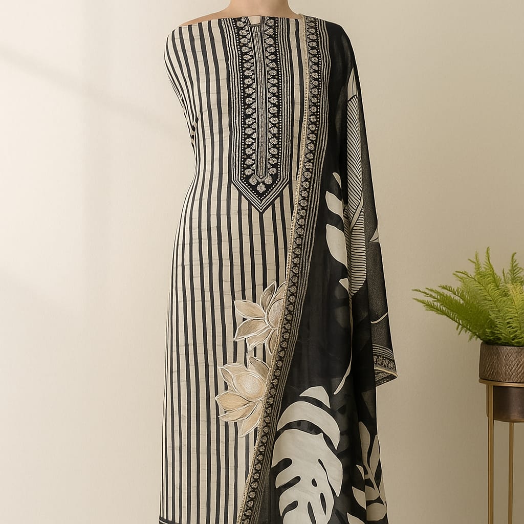 Make a bold yet graceful statement with this modern black unstitched suit set crafted from high-quality mul chanderi fabric. Featuring an eye-catching white & black striped design with geometric accents, this suit exudes elegance with a touch of contemporary minimalism.