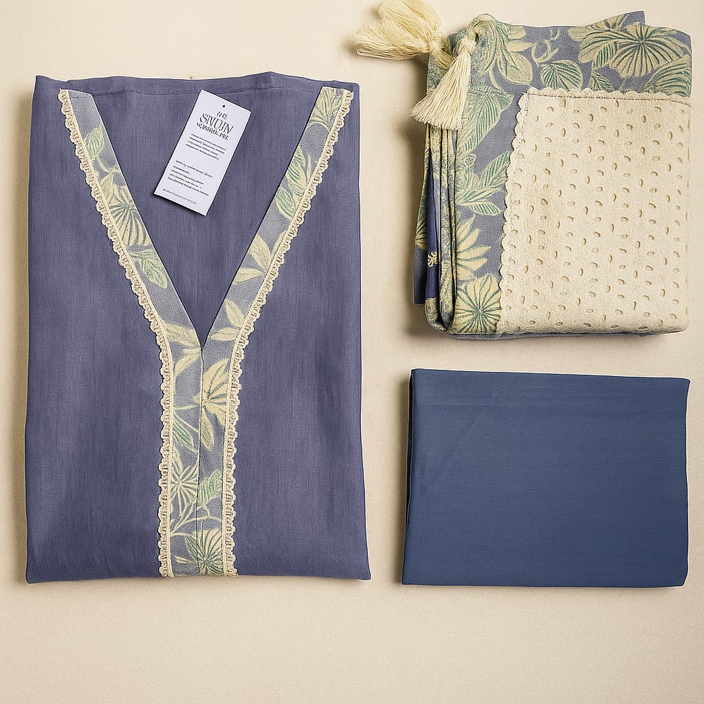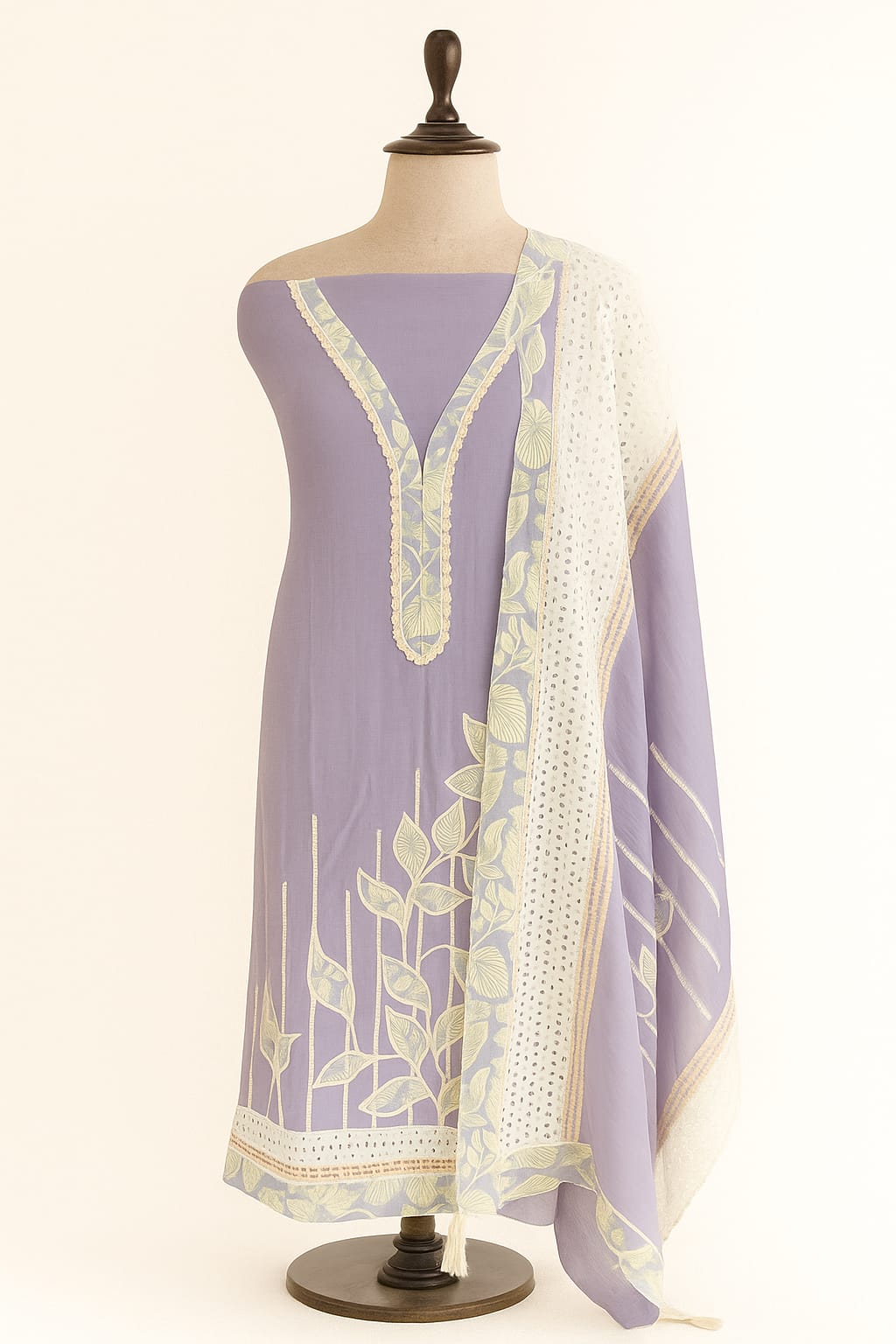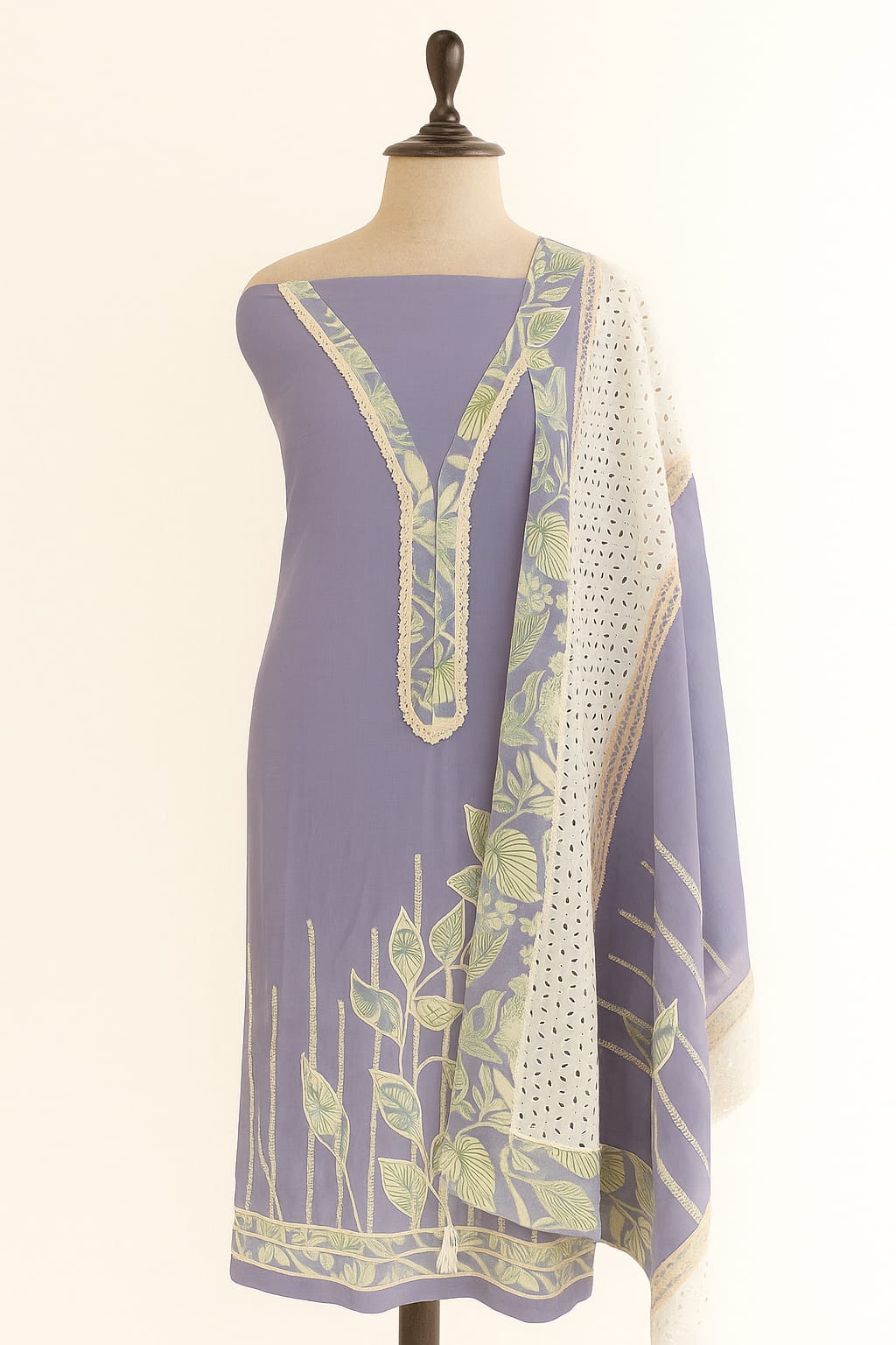 This elegant unstitched three-piece suit features a soothing purple base complemented by soft mint-green botanical prints. The fabric drapes gracefully, offering a refined and comfortable look suitable for both casual and semi-formal wear. The set includes a beautifully printed front panel, a coordinated back and sleeves piece, and a contrasting eyelet embroidered & prints, ivory beats on kurta ,dupatta that adds a touch of sophistication. Its pastel palette and nature-inspired motifs make it perfect for spring and summer seasons.