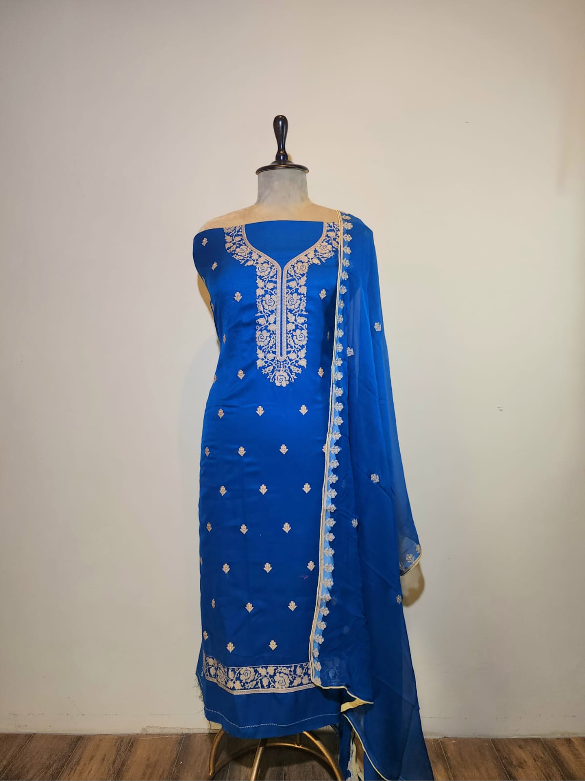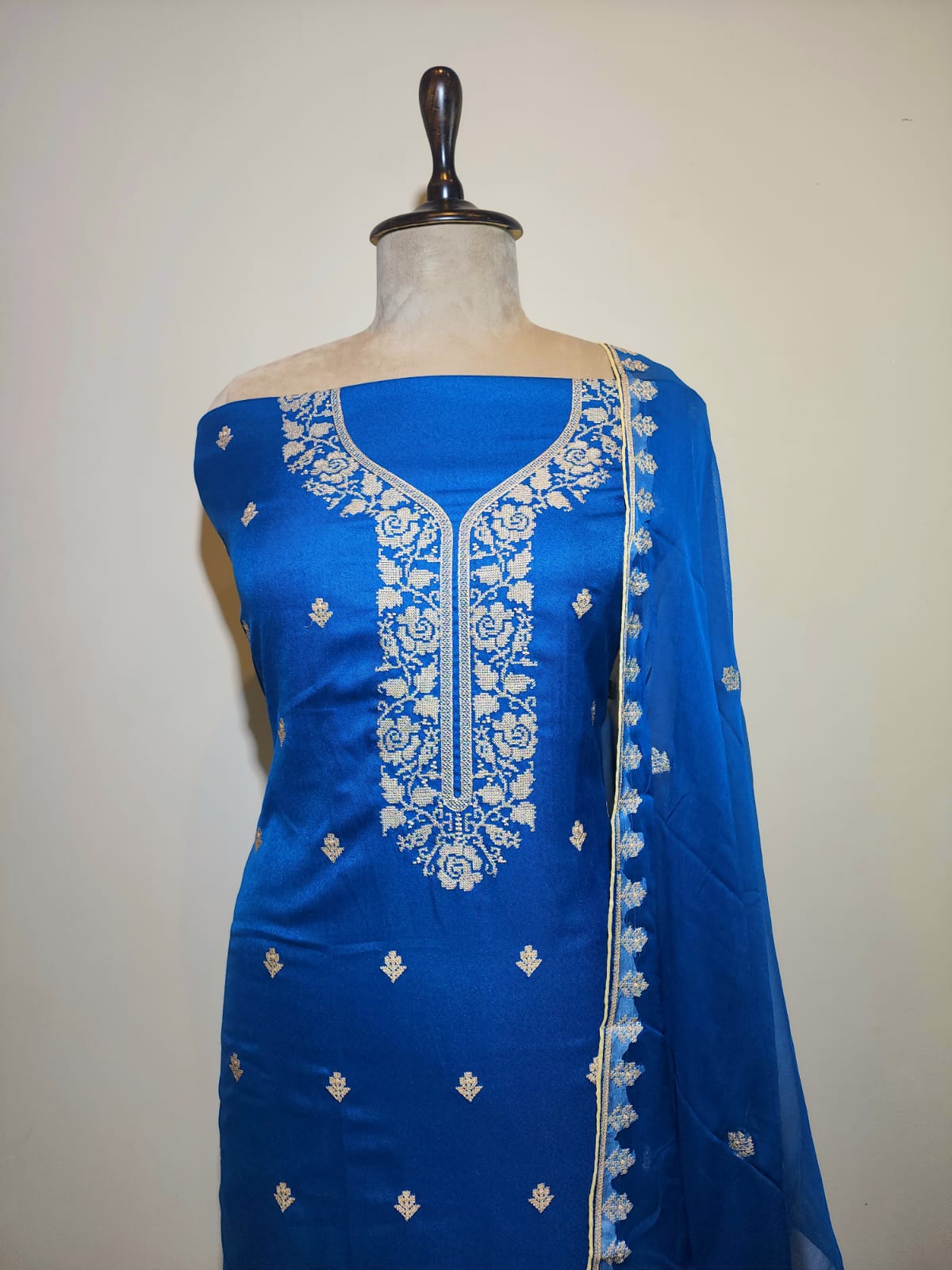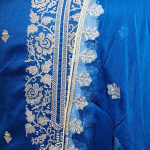 Introducing this exquisite Royal Blue Unstitched Embroidered Suit Set, designed to bring grace and sophistication to your ethnic collection. Crafted with attention to detail, this ensemble beautifully combines traditional embroidery with a modern color palette.