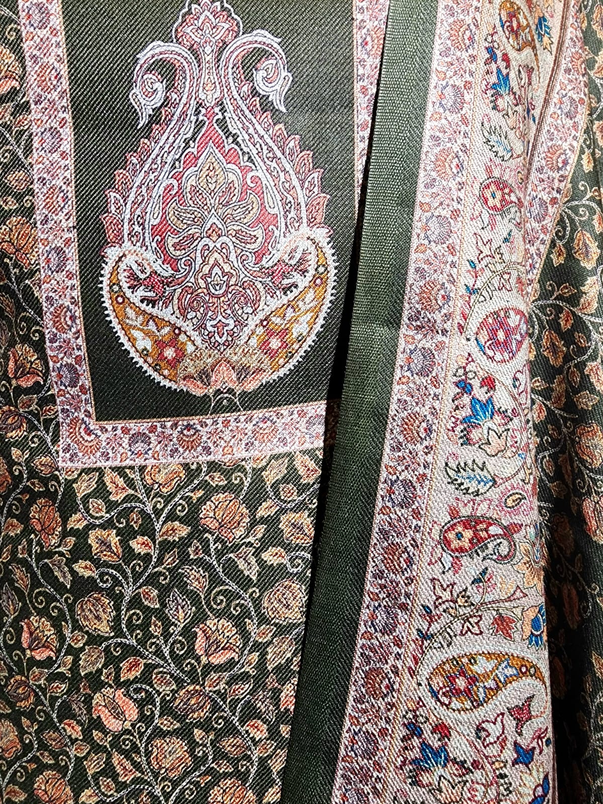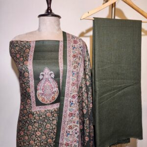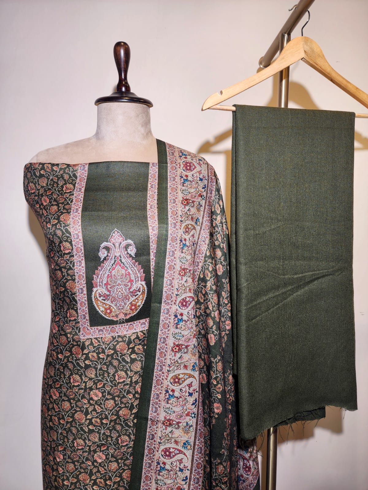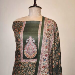 Enhance your ethnic wardrobe with this elegant unstitched suit fabric featuring a stunning floral design. The fabric displays a sophisticated green tones, creating a graceful and timeless appeal. Its intricate motifs are beautifully balanced with a coordinated dupatta-style drape that includes subtle linear and floral elements.