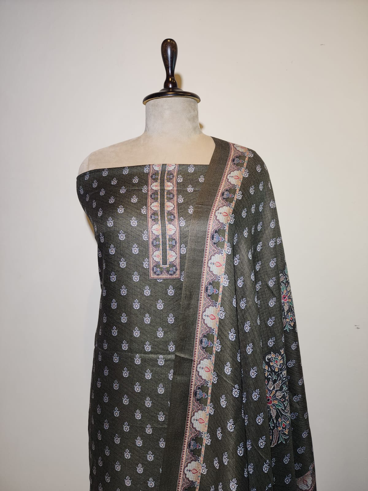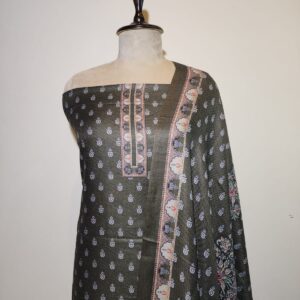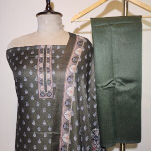 Enhance your ethnic wardrobe with this elegant unstitched suit fabric featuring a stunning floral design . The fabric displays a sophisticated green tones, creating a graceful and timeless appeal. Its intricate motifs are beautifully balanced with a coordinated dupatta-style drape that includes subtle linear and floral elements.
