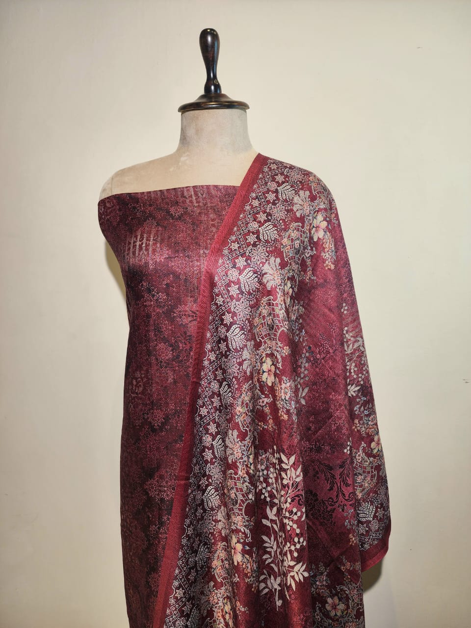Enhance your ethnic wardrobe with this elegant unstitched suit fabric featuring a stunning floral design. The fabric displays a sophisticated mix of white,maroon,black tones, creating a graceful and timeless appeal. Its intricate motifs are beautifully balanced with a coordinated dupatta-style drape that includes subtle linear and floral elements.