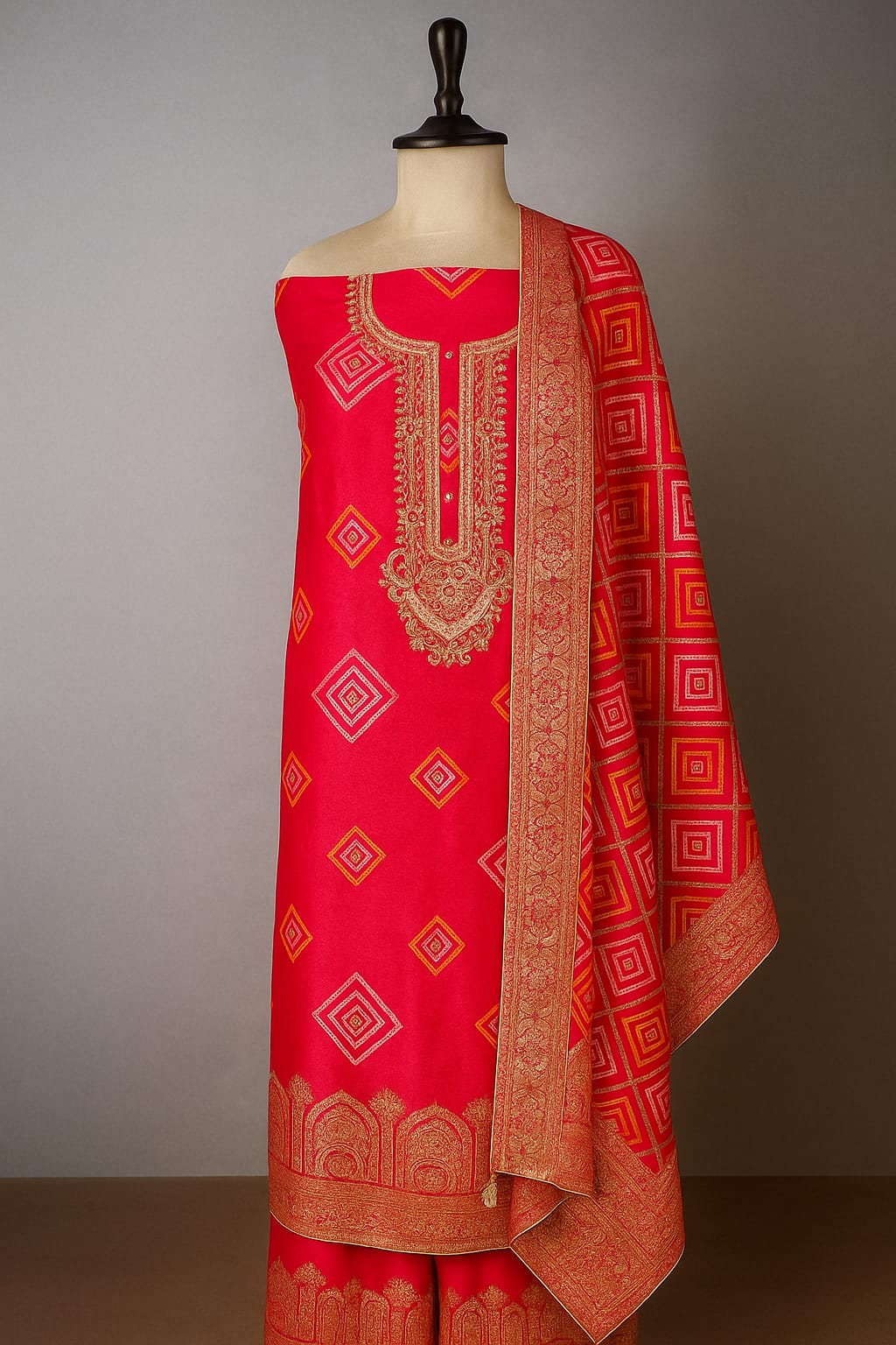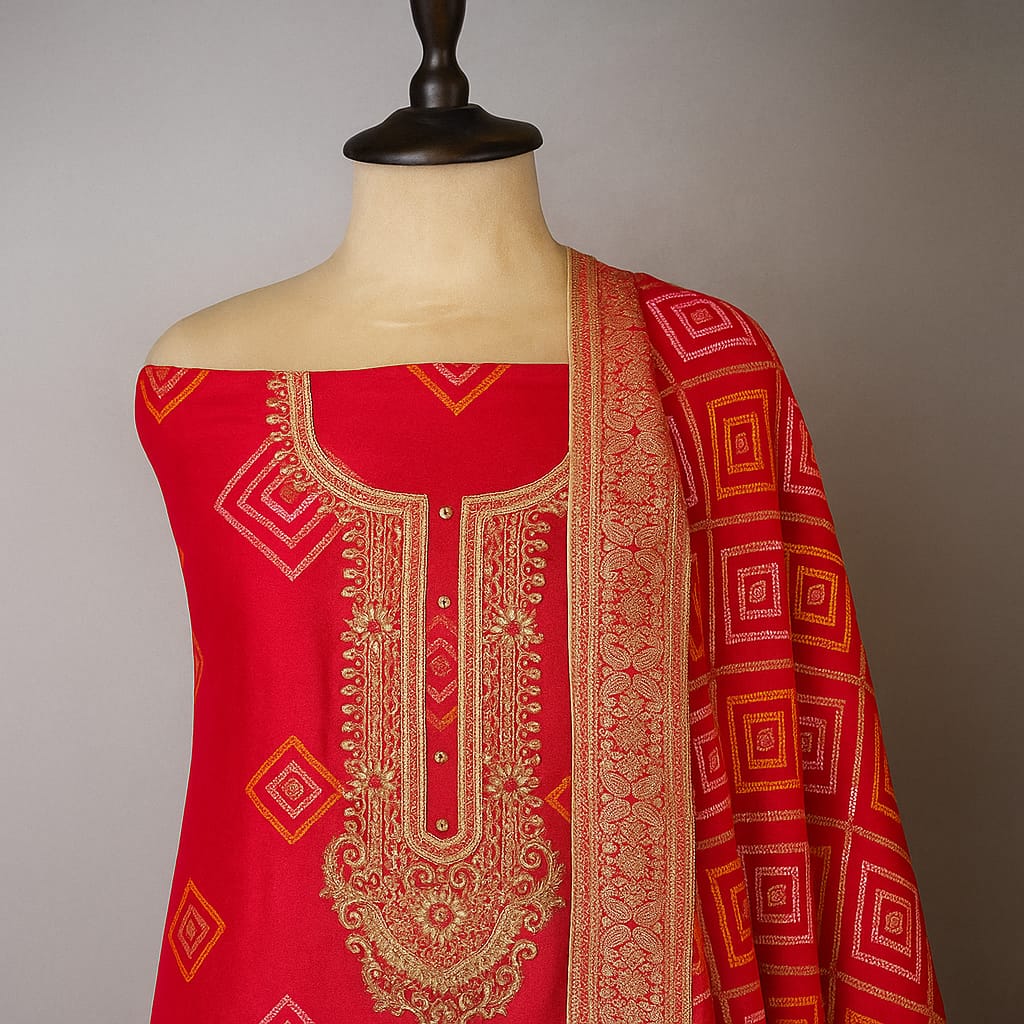 This exquisite ensemble features a red fabric adorned with golden zari and bandhej offering a rich and elegant appearance. The dupatta is bordered with an intricately yellow and golden Bandhej adding a traditional charm.