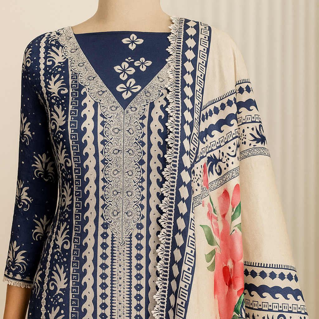 Radiate charm and elegance in this vibrant blue unstitched suit set, a perfect blend of tradition and modern finesse. The kurta features intricate embroidery in soft ivory hues, accentuated with vertical floral and ornamental motifs that flatter the silhouette. The neckline is tastefully highlighted with a delicately embroidered V-design, adding a regal touch.