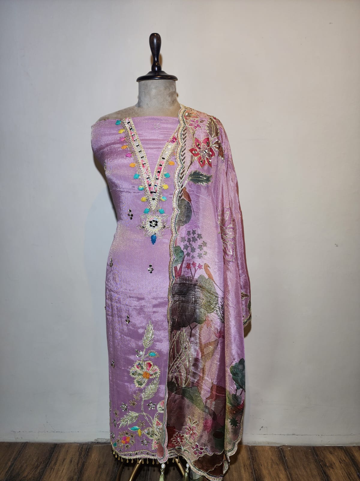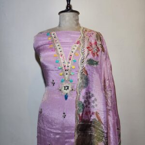Unveil your inner royalty with Noor-E-Gota, a radiant unstitched suit set crafted in delicate pink tissue fabric. The set is graced with floral print elegant gota along the neckline and kurta front, giving it a subtle yet regal shimmer. The matching printed dupatta echoes the same artistry, framed with tassels,gota for a timeless finish.