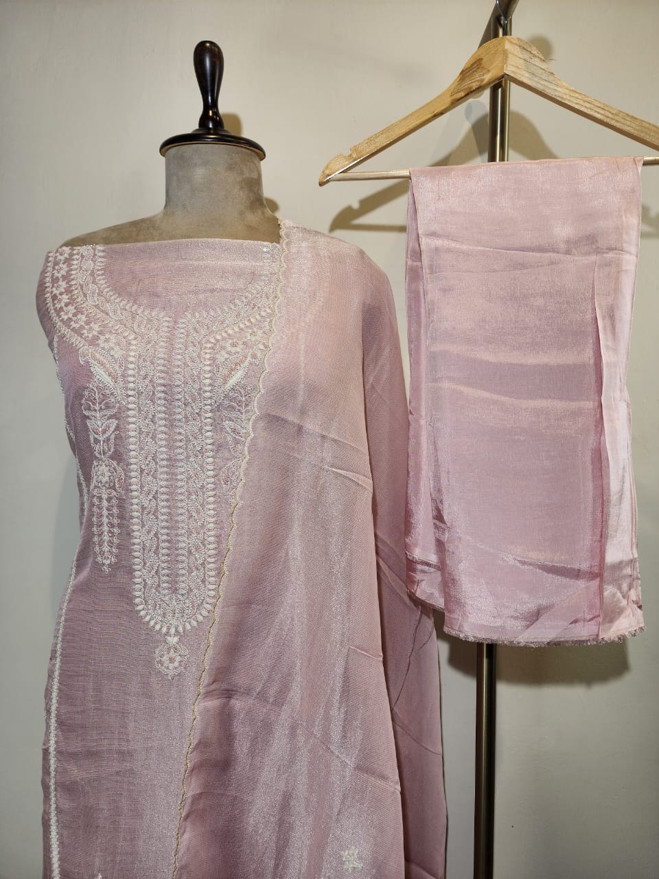 The kurta fabric is adorned with small, embroidered motifs and white beads on neck while the dupatta showcases graceful solid dupatta with along lace the edges, creating a soft yet sophisticated look. Perfect for daywear, festive brunches, or office elegance, this set is a versatile addition to any ethnic wardrobe.