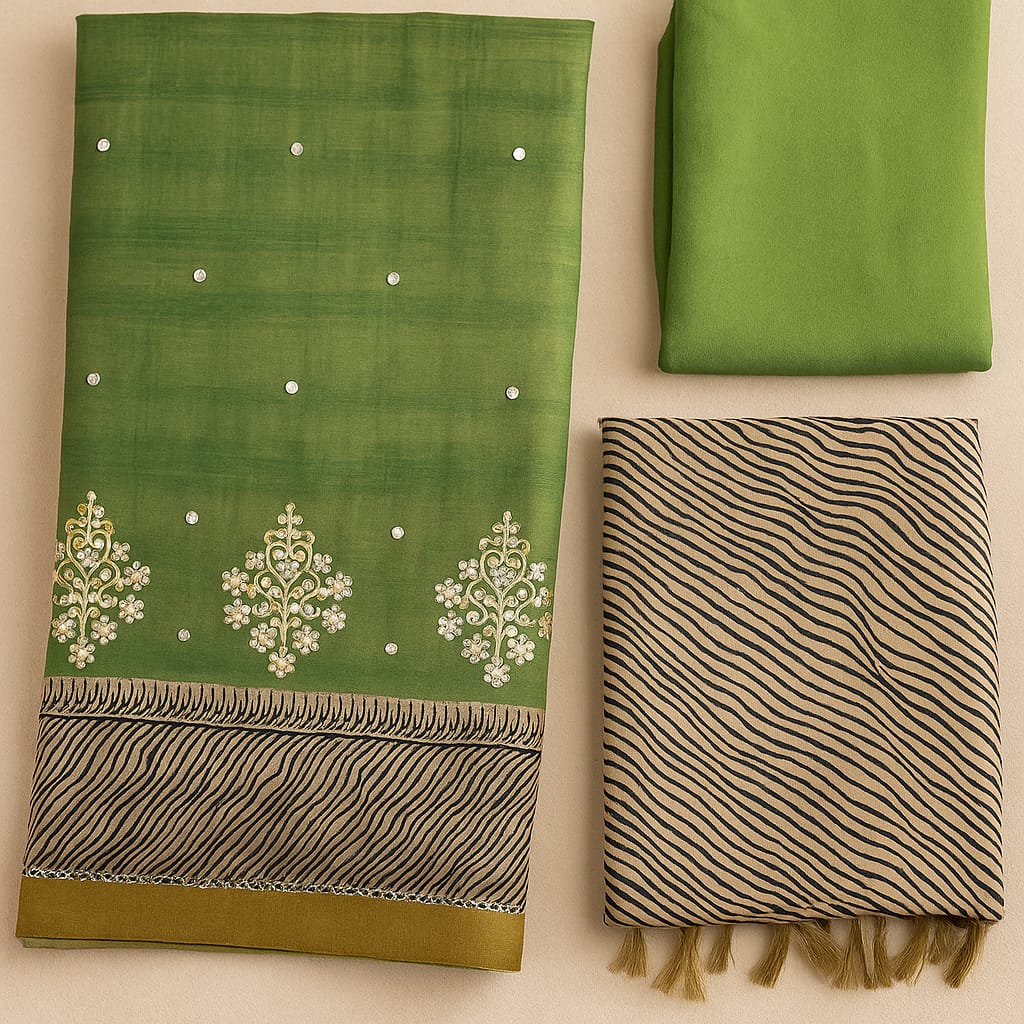 The dupatta is a masterpiece on its own, boasting a sophisticated Ombre effect transitioning from Green to Teal, bordered with classic zari stripes and a bold black & white chevron print that adds a modern twist.